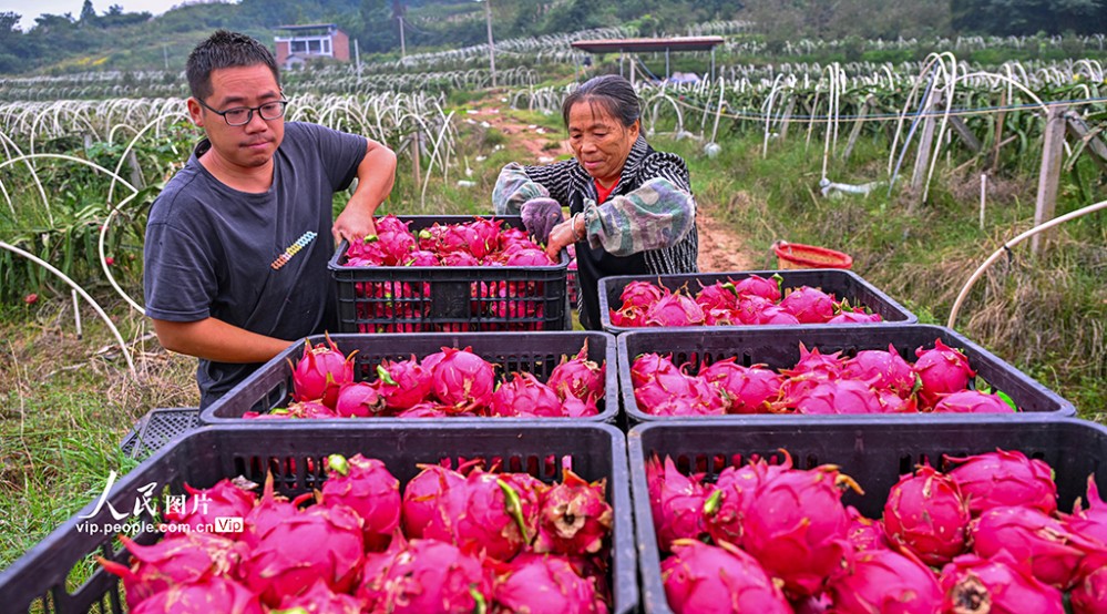 連日來,四川省眉山市仁壽縣懷仁街道吊慶社區(qū)的火龍果喜迎豐收,果農(nóng)們忙著采摘、轉(zhuǎn)運(yùn),供應(yīng)市場。