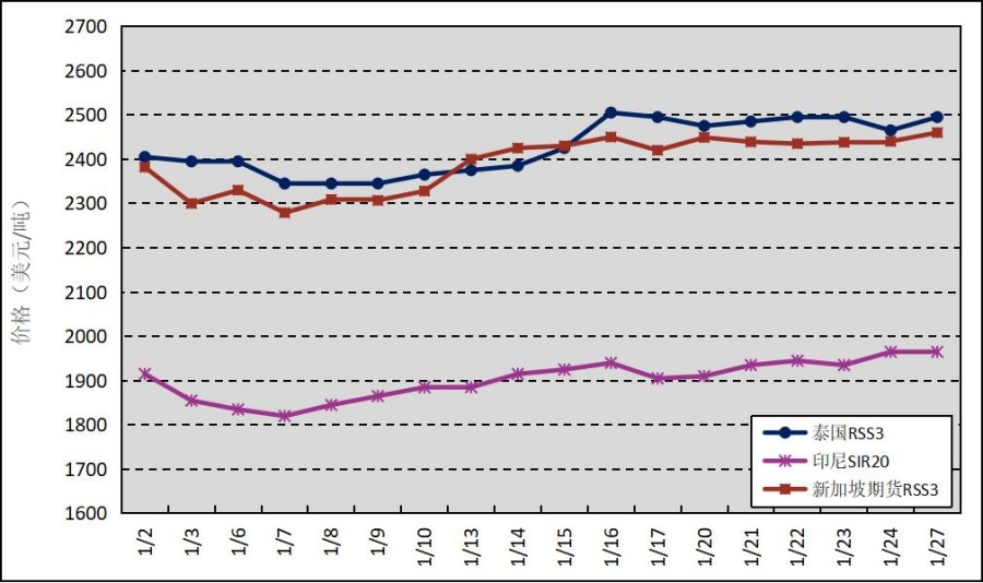國外主產(chǎn)區(qū):1月,泰國RSS3平均價格為2427美元/噸,環(huán)比下跌30美元/噸,最高價為2505美元/噸,最低價為2345美元/噸;印尼SIR20平均價格為1903美元/噸,環(huán)比下跌63美元/噸,最高價為1965美元/噸,最低價為1820美元/噸;新加坡RSS3期貨主力合約月均結(jié)算價格為2390美元/噸,環(huán)比下跌34美元/噸,最高價為2460美元/噸,最低價為2279美元/噸。
