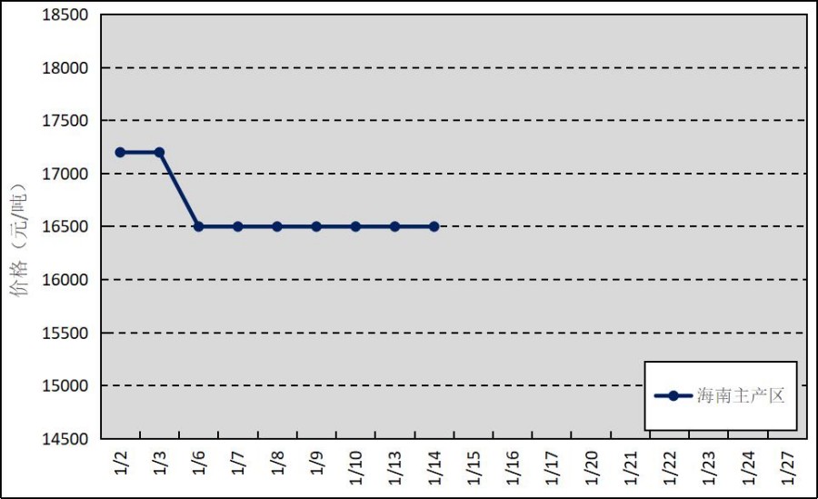 國內(nèi)主產(chǎn)區(qū):1月中旬,海南產(chǎn)區(qū)停割,至此國內(nèi)膠園全部進入停割期。海南原料膠(折干膠)月均價格為16656元/噸,環(huán)比下跌626元/噸。