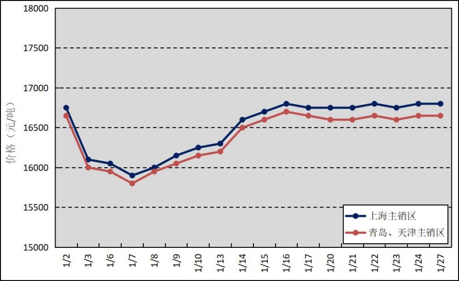 國內(nèi)主銷區(qū):1月,國產(chǎn)全乳標準膠上海市場平均價格16500元/噸,環(huán)比下跌736元/噸,最高價為16800元/噸,最低價為15900元/噸;青島市場和天津市場平均價格16386元/噸,環(huán)比下跌764元/噸,最高價為16700元/噸,最低價為15800元/噸。
