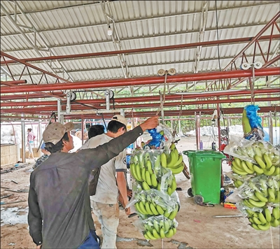 柬埔寨桔井省一家中資香蕉種植園內(nèi),工作人員將采摘后的香蕉掛上運往包裝廠的軌道車。