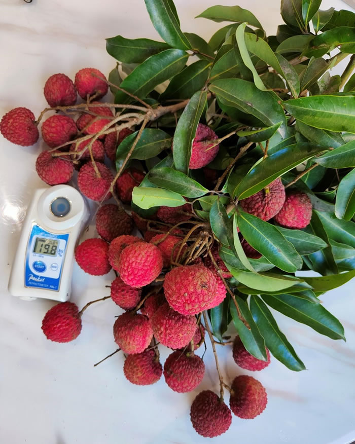 專家組在福建省漳州市云霄縣東廈鎮(zhèn)東崎村清堯家庭農(nóng)場進(jìn)行現(xiàn)場測產(chǎn)與品質(zhì)鑒定,認(rèn)真聽取了選育團(tuán)隊(duì)對‘鳳山紅燈籠’荔枝新品種選育情況的匯報(bào),就有關(guān)問題進(jìn)行了質(zhì)詢與討論,經(jīng)現(xiàn)場測產(chǎn),2003年高接的18年生樹平均株產(chǎn)108.4kg、折合畝產(chǎn)1518.1kg、平均單果重22.2g、 焦核率82.0%、可溶性固形物19.1%、可食率84.3%;果實(shí)肉質(zhì)細(xì)嫩、清甜多汁,品質(zhì)優(yōu)。一致同意該品種通過現(xiàn)場鑒評。