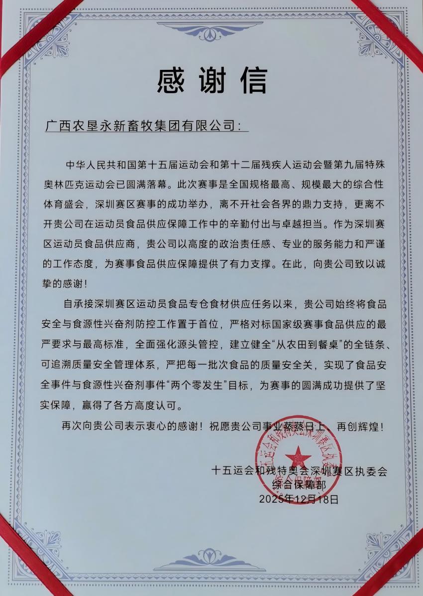 近日,永新畜牧集團(tuán)收到第十五屆全國運(yùn)動會和第十二屆殘疾人運(yùn)動會暨第九屆特殊奧林匹克運(yùn)動會深圳賽區(qū)執(zhí)委會發(fā)來的感謝信,對其在賽事期間的豬肉供應(yīng)保障工作給予高度評價(jià)與誠摯感謝。一封感謝信,不僅是國家級賽事對永新畜牧集團(tuán)的肯定,更是對其全產(chǎn)業(yè)鏈深耕的認(rèn)可。