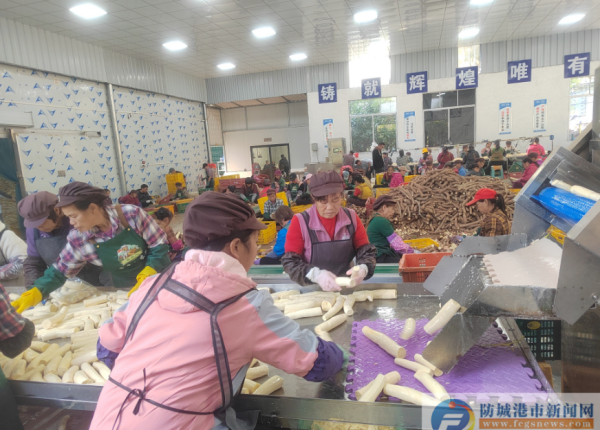 近日,在防城港市防城區(qū)大菉鎮(zhèn)喜農(nóng)人種養(yǎng)專業(yè)合作社(以下簡稱喜農(nóng)人合作社)“華南9號(hào)”黃心木薯加工廠現(xiàn)場,工人們正熟練地操作手中的工具將木薯剝皮、取芯,清理后的木薯被傳送帶送入機(jī)器內(nèi)清洗,再由工人真空打包后送往冷凍庫冷藏,現(xiàn)場一派繁忙景象。