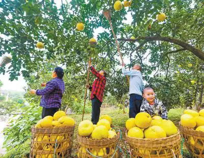 重慶市墊江縣黃沙鎮(zhèn)長(zhǎng)紅社區(qū),村民在收獲柚子。 龔長(zhǎng)浩攝(人民視覺)