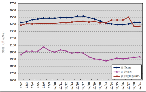 國(guó)外主產(chǎn)區(qū):12月,泰國(guó)RSS3平均價(jià)格為2457美元/噸,環(huán)比上漲96美元/噸,最高價(jià)為2515美元/噸,最低價(jià)為2395美元/噸;印尼SIR20平均價(jià)格為1965美元/噸,環(huán)比上漲60美元/噸,最高價(jià)為2075美元/噸,最低價(jià)為1875美元/噸;新加坡RSS3期貨主力合約月均結(jié)算價(jià)格為2424美元/噸,環(huán)比上漲108美元/噸,最高價(jià)為2500美元/噸,最低價(jià)為2368美元/噸。