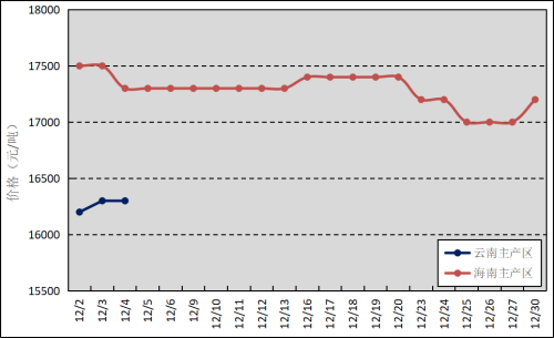 國(guó)內(nèi)主產(chǎn)區(qū):12月,云南產(chǎn)區(qū)在月初基本停割,海南產(chǎn)區(qū)原料產(chǎn)出較上月有所縮減。云南、海南鮮膠乳(折干膠)月均價(jià)格分別為16276元/噸、17282元/噸,環(huán)比上漲119元/噸、96元/噸。