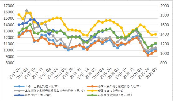 注:數(shù)據(jù)來(lái)源于中國(guó)農(nóng)墾經(jīng)濟(jì)發(fā)展中心、中國(guó)天然橡膠協(xié)會(huì),主縱坐標(biāo)為全乳膠上海、山東市場(chǎng)均價(jià),上海期貨交易所天然橡膠主力合約月均價(jià),次縱坐標(biāo)為泰國(guó)RSS3、印尼SIR20、馬來(lái)西亞SMR20的離岸月均價(jià)。
