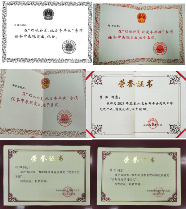 12.中心干部職工積極創(chuàng)優(yōu)爭先,獲得榮譽表彰8項。葉瑞云同志在農(nóng)業(yè)農(nóng)村部“以秋補夏、抗災奪豐收”專項任務中獲個人記功,劉芳、樊思雨同志獲個人嘉獎。李泓同志獲得2023年度農(nóng)業(yè)農(nóng)村部平安建設先進個人稱號。劉陽同志獲得2022—2023年度部直屬機關優(yōu)秀工會干部榮譽稱號。馬晨雨同志在2023年度部分直屬團組織書記述職評議考核被評價為“好”。季剛同志獲得2021—2023年度農(nóng)業(yè)農(nóng)村部直屬機關青年理論學習標兵榮譽稱號。林殿惠獲得農(nóng)業(yè)農(nóng)村部系統(tǒng)離退休干部先進個人榮譽稱號。