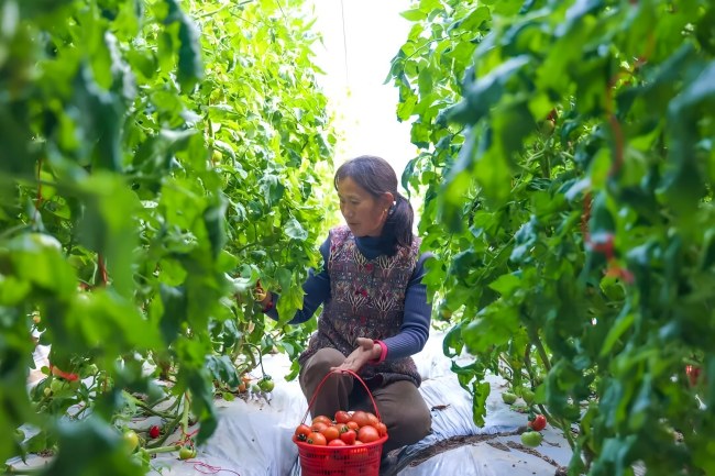 早春時節(jié),云臺農(nóng)場云水灣景區(qū)日光溫室大棚里暖意融融,滿眼翠綠的番茄藤蔓順著吊繩向上攀爬,枝葉舒展、層層疊疊,掛滿了圓潤飽滿的番茄。紅的似瑪瑙,黃的如琥珀,在陽光的照射下泛著誘人的光澤,在翠綠枝葉的映襯下格外吸睛,成為大棚里最亮眼的“明星果實”。