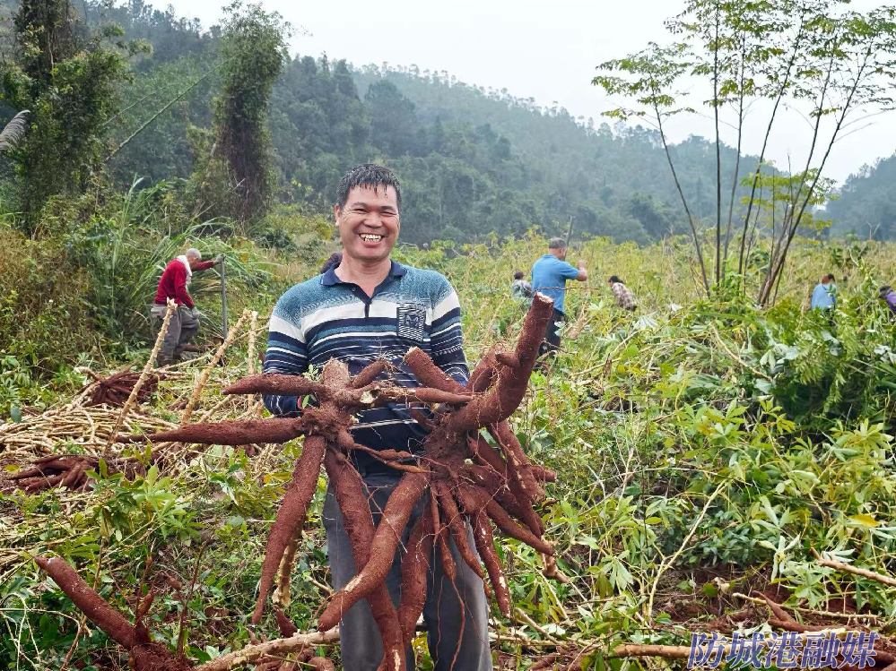 近日,防城區(qū)大菉鎮(zhèn)坡稔村的木薯種植基地一片繁忙景象,連片的黃心木薯長勢繁茂喜人,村民們手持農(nóng)具,撬土開挖,一個個碩大飽滿的木薯接連破土而出,田間歡聲笑語不斷,處處洋溢著豐收的喜悅。