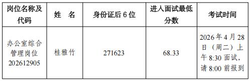 我單位2026年度公開招聘高校畢業(yè)生面試公告發(fā)布后,有1名考生因個人原因自愿放棄面試資格。經(jīng)研究,決定在報考同一崗位的考生中,按照筆試成績由高到低的順序進行遞補。遞補考生名單如下: