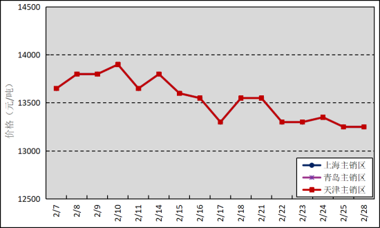 圖2  2022年2月國內(nèi)主銷區(qū)天然橡膠價(jià)格走勢