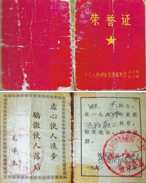 新疆生產(chǎn)建設(shè)兵團搬走了,但是正規(guī)的軍墾制度卻留下來了。上圖為1970年易貢農(nóng)場頒發(fā)的“五好職工”證書封面及內(nèi)頁,是西藏軍區(qū)生產(chǎn)建設(shè)師時代,新易貢團發(fā)出的第一批榮譽證中的一張。
