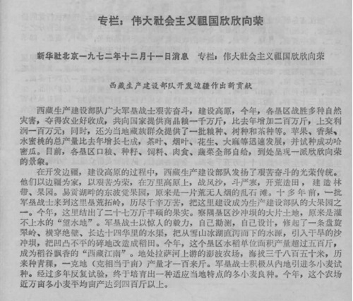 1972年,新華社《偉大社會主義祖國欣欣向榮》專欄,對西藏生產(chǎn)建設(shè)開發(fā)部隊的成就做了專題報道。他們以邊疆為家,以艱苦為榮,在萬里高原上,戰(zhàn)風(fēng)沙,斗嚴寒,開荒造田,建造林帶、果園。
