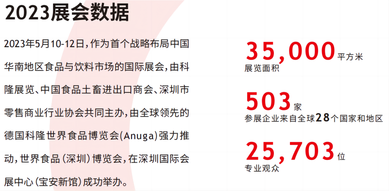 由德國科隆世界食品博覽會(Anuga)強力推動,科隆展覽、中國食品土畜進出口商會、深圳市零售商業(yè)行業(yè)協(xié)會共同主辦,ANUFOOD China 2023世界食品(深圳)博覽會于2023年5月10-12日在深圳國際會展中心(寶安新館)順利舉辦。本屆展會累計吸引25,703位食飲行業(yè)人士觀展,展覽總面積達到35,000平方米,參展企業(yè)數(shù)量達503家,來自全球近30個國家和地區(qū),涵蓋甜食及休閑食品、肉類、乳制品、精細食品、海產(chǎn)及冷凍食品、植物基及健康食品、咖啡與茶、飲料(酒精與非酒精)、食品與飲料技術、餐飲服務與技術等食品與飲料全產(chǎn)業(yè)鏈。同期還舉辦歐洲最大的烘焙咖啡行業(yè)盛會SIGEP在華子展——SIGEP China深圳國際手工冰淇淋、烘焙及咖啡展覽會。