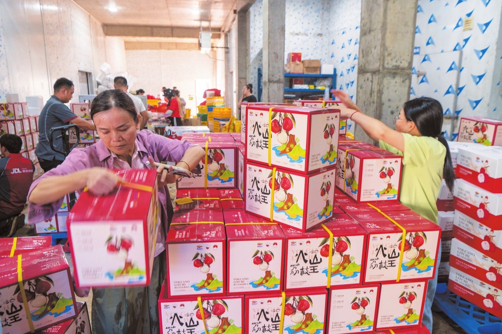 近日,在??诨鹕嚼笾Ψ謷行?,工作人員正打包新鮮采摘的火山荔枝王。本報(bào)記者 石中華 攝