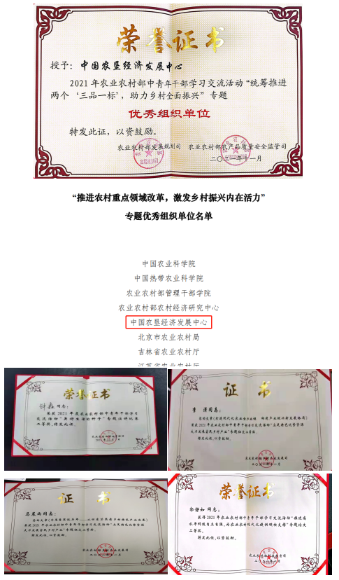 10. 在2021年農(nóng)業(yè)農(nóng)村部中青年干部交流論壇中,中國農(nóng)墾經(jīng)濟發(fā)展中心分獲專題二及專題三優(yōu)秀組織單位;青年同志累計投稿27篇,獲獎16項,其中,鐘鑫、桂丹、李瀟、馬晨雨、郭靜如、季剛獲得二等獎;許冠堂、郭靜如、季剛獲得三等獎;桂丹、羅菁菁、李晨萌、張若凡獲得優(yōu)秀獎;鐘鑫還獲得專題七演講比賽二等獎。在“永遠跟黨走”農(nóng)業(yè)農(nóng)村部慶祝中國共產(chǎn)黨成立100周年職工書畫攝影展中,羅菁菁同志獲得“攝影類三等獎”。