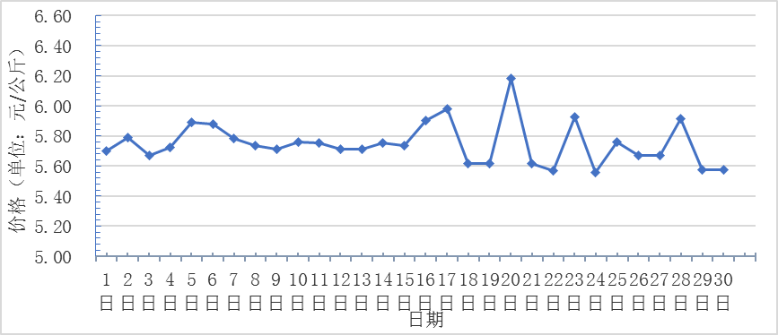 6月,全國(guó)重點(diǎn)監(jiān)測(cè)農(nóng)產(chǎn)品批發(fā)市場(chǎng)香蕉總交易量達(dá)2.2萬(wàn)噸,同比下降4.3%,環(huán)比下降15.4%;總交易價(jià)值11480.5萬(wàn)元,同比下降25.2%,環(huán)比下降12.4%。日平均價(jià)格最高為6.2元/千克,最低為5.6元/千克,全月平均價(jià)格為 5.8元/千克,同比下降13.4%,環(huán)比上漲11.5%(每日價(jià)格變化如圖)。