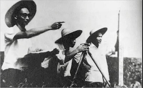 野外工作開始后,大學(xué)生們每天都要抱一大捆竹子、木樁、測(cè)繩,早出晚歸。因?yàn)闇y(cè)量時(shí)首先用經(jīng)緯儀測(cè)好2條互相垂直的基線,再在角線上插上竹竿,即按三點(diǎn)成一線的原理延伸,邊插邊量,交匯成300畝大的網(wǎng)格。這種測(cè)量方法名叫“方格控制測(cè)量”,方法簡(jiǎn)單易行,且不需要太多儀器。