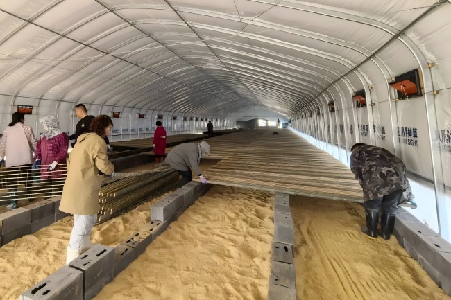 走進寬敞規(guī)整的養(yǎng)殖大棚,鋼架結構穩(wěn)固挺拔,松軟稻殼均勻鋪底,整齊水泥磚有序排列成支撐基座,一片片竹排平穩(wěn)鋪設其上。大家分工協(xié)作、配合默契,搬運竹材、定位基座、鋪設竹排,每一道工序細致嚴謹、力求標準規(guī)范?!靶耐惶幭?、勁往一處使,看著鵝群棲息平臺一步步成型,大家都充滿干勁與成就感?!爆F(xiàn)場一位工作人員笑著說道。