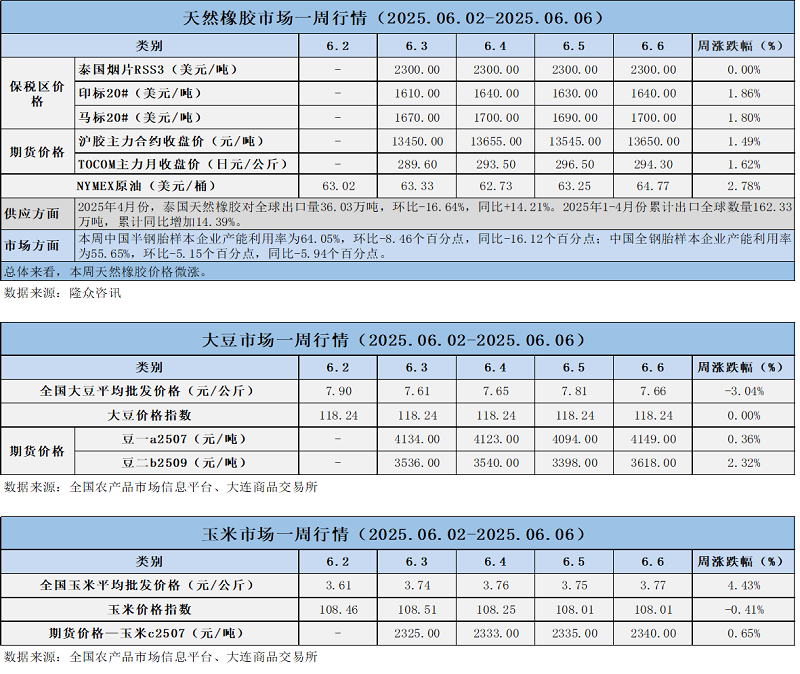 天然橡膠、大豆、玉米市場一周行情(2025.06.02-06.06)