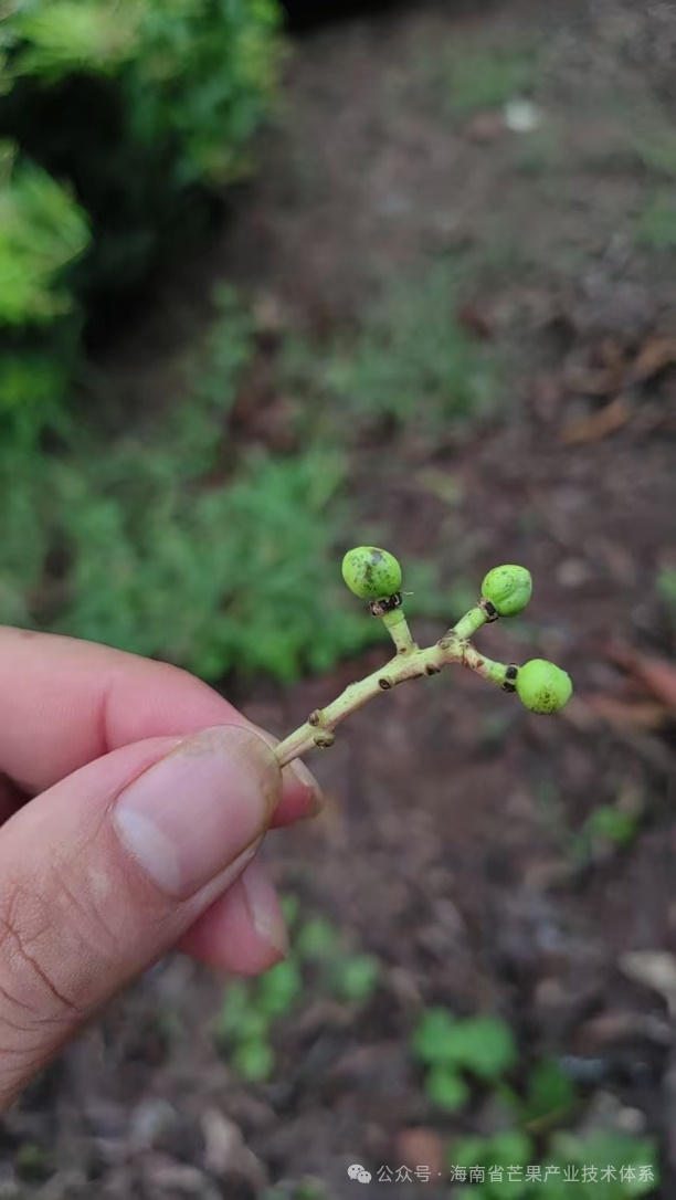 幼果期果園:迎風(fēng)面的芒果樹(shù)幼果受風(fēng)害影響,果面變黑,后期易變黑脫落(2024年9月7日拍攝于樂(lè)東黎族自治縣利國(guó)鎮(zhèn)附近一果園)