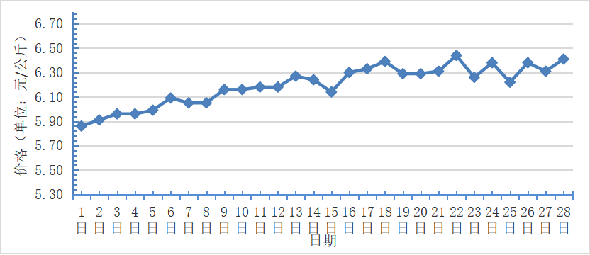 2月,全國香蕉銷售日平均價格最高為6.4元/千克,最低為5.9元/千克,全月平均價格為6.2元/千克,同比上漲5.1%,環(huán)比上漲10.7%(每日價格變化如圖)。