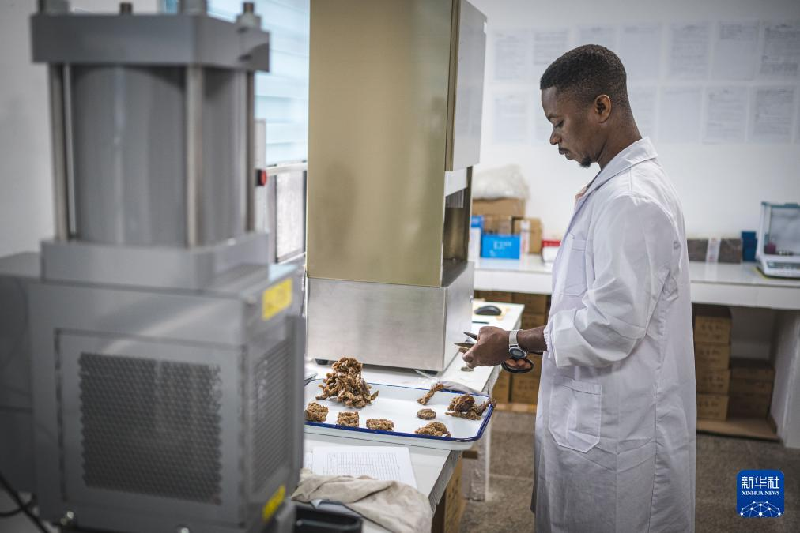 車間內(nèi),當?shù)毓と耸炀毑僮髦a(chǎn)線上的機器,新鮮膠乳經(jīng)過凝固、壓片、烘干等工序,最終變成方正的標準膠塊。實驗室里,技術人員記錄著橡膠樣品的彈性和韌性數(shù)據(jù),確保每批產(chǎn)品符合國際標準。