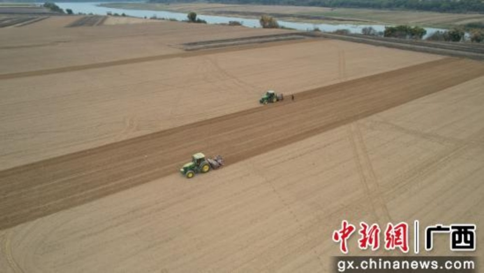 2月10日,記者來到象州縣運江鎮(zhèn)芽村的千畝連片甘蔗種植基地,2臺安裝有北斗導航輔助駕駛系統(tǒng)的拖拉機在蔗田里來回穿梭,一次性完成開溝、下種、施肥、覆土等工序。