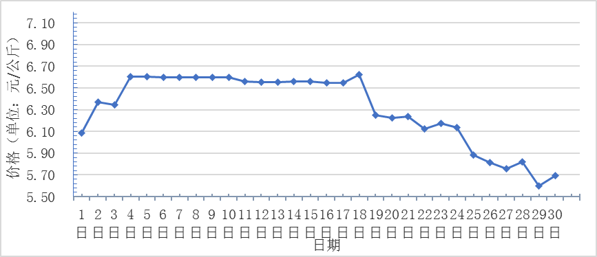 9月,全國重點監(jiān)測農(nóng)產(chǎn)品批發(fā)市場香蕉總交易量達(dá)2.5萬噸,同比下降10.7%,環(huán)比上漲8.7%;總交易價值 16111.8萬元,同比下降4%,環(huán)比上漲11.6%。日平均價格最高為6.6元/千克,最低為5.6元/千克,全月平均價格為6.3元/千克,同比上漲14.5%,環(huán)比上漲3.3%(每日價格變化如圖)。