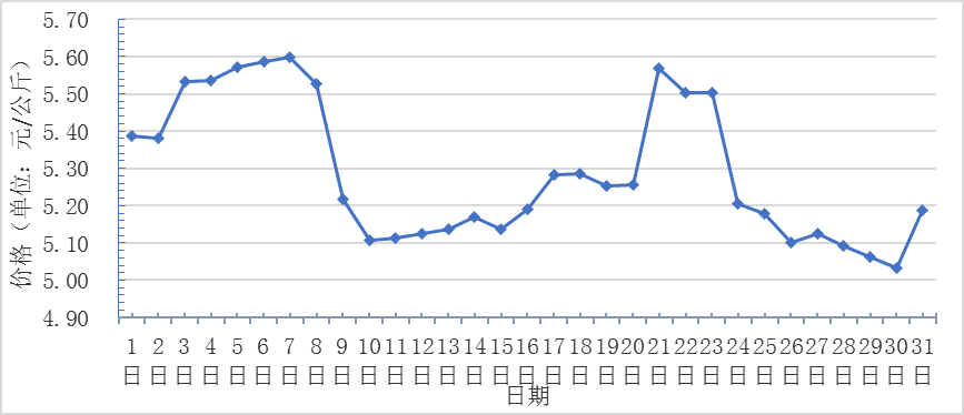 1月,全國重點(diǎn)監(jiān)測(cè)農(nóng)產(chǎn)品批發(fā)市場(chǎng)香蕉總交易量達(dá)9.9萬噸,同比增22.2%,環(huán)比增4.2%;總交易價(jià)值58419.5萬元,同比增56.6%,環(huán)比增3.0%。日平均價(jià)格最高為5.6元/千克,最低為5.0元/千克,全月平均價(jià)格為5.3元/千克,同比上漲8.1%,環(huán)比下降8.6%(每日價(jià)格變化如圖)。
