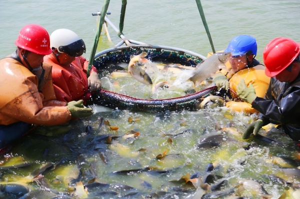 捕撈工作緊張而有序地進(jìn)行著。工人們身穿防水衣褲,熟練地操控著漁網(wǎng)在水中行進(jìn)。隨著漁網(wǎng)的逐漸收緊,水面上泛起了層層漣漪,鯉魚(yú)們開(kāi)始在水中翻騰跳躍,仿佛在歡慶這一豐收的時(shí)刻。捕撈上來(lái)的鯉魚(yú)被迅速分揀、稱重,并裝入事先準(zhǔn)備好的貨車水箱中,準(zhǔn)備運(yùn)往市場(chǎng)銷售。“這一車是發(fā)往湖北荊州的,老板一直在催,得抓緊去交貨?!彼緳C(jī)小李一邊拍著鯉魚(yú)的視頻一邊介紹說(shuō)。