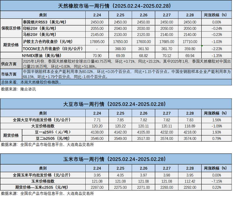 天然橡膠、大豆、玉米市場一周行情(2025.02.24-02.28)