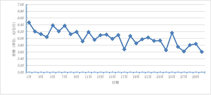 6月,全國(guó)重點(diǎn)監(jiān)測(cè)農(nóng)產(chǎn)品批發(fā)市場(chǎng)香蕉總交易量達(dá) 2.1萬噸,同比下降74.7%,環(huán)比上漲10.5%;總交易價(jià)值 14442.4萬元,同比下降62.7%,環(huán)比上漲5.0%。日平均價(jià)格最高為6.2元/千克,最低為5.6元/千克,全月平均價(jià)格為 6.0元/千克,同比上漲22.4%,環(huán)比下降10.4%(每日價(jià)格變化如圖)。