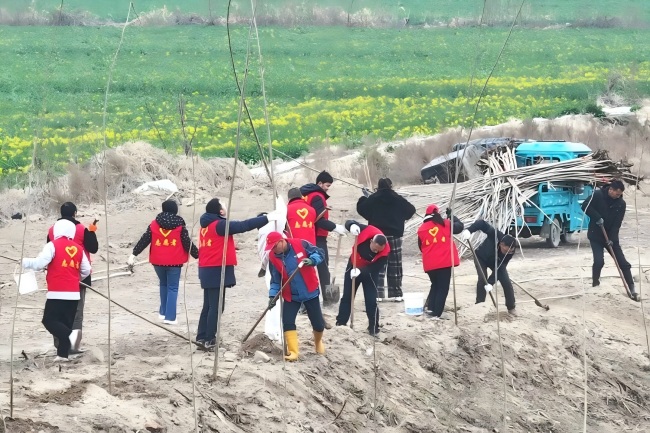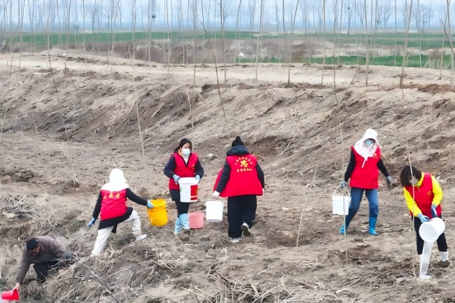植樹現(xiàn)場一派熱火朝天的勞作景象。一捆捆楊樹苗整齊碼放,靜待扎根沃土。林業(yè)公司技術(shù)人員詳細講解樹苗種植要點后,志愿者們隨即分組協(xié)作,三人一組、四人一隊,或扶苗定位、或填土穩(wěn)固、或提水澆灌,每個環(huán)節(jié)嚴謹細致、有條不紊。身著鮮艷志愿紅馬甲的志愿者們穿梭其間,與新栽樹苗相映成趣,構(gòu)成春日里一道靈動的風(fēng)景線。大家熱情高漲、干勁十足,臉上洋溢著勞作的喜悅,歡聲笑語與鐵鍬鏟土的聲響交織,奏響了植綠護綠的春日序曲。