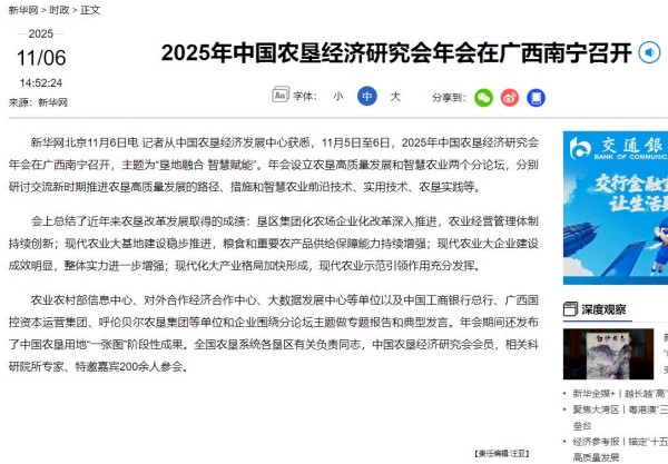 組織舉辦2025年中國農墾經濟研究會年會,新華社宣傳報道。