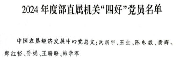 陳忠毅、王生、武新宇、黃輝、孫娟、鄭紅裕、王盼盼等同志獲評2024年度農業(yè)農村部直屬機關“四好”黨員。