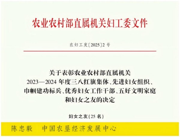 陳忠毅同志獲農業(yè)農村部直屬機關2023—2024年度婦女之友。