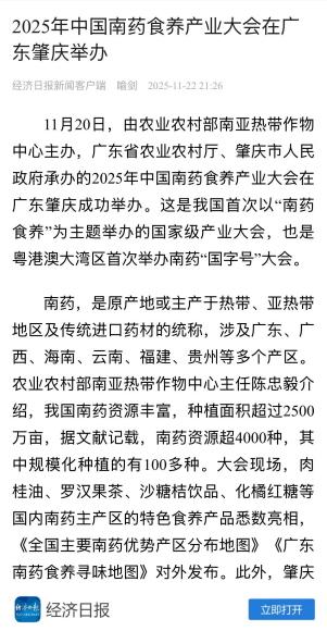 農墾中心主辦,廣東省農業(yè)農村廳、肇慶市人民政府承辦的2025年中國南藥食養(yǎng)產業(yè)大會在廣東肇慶成功舉辦,工作報告獲分管部領導肯定性批示,經濟日報等媒體報道大會情況。