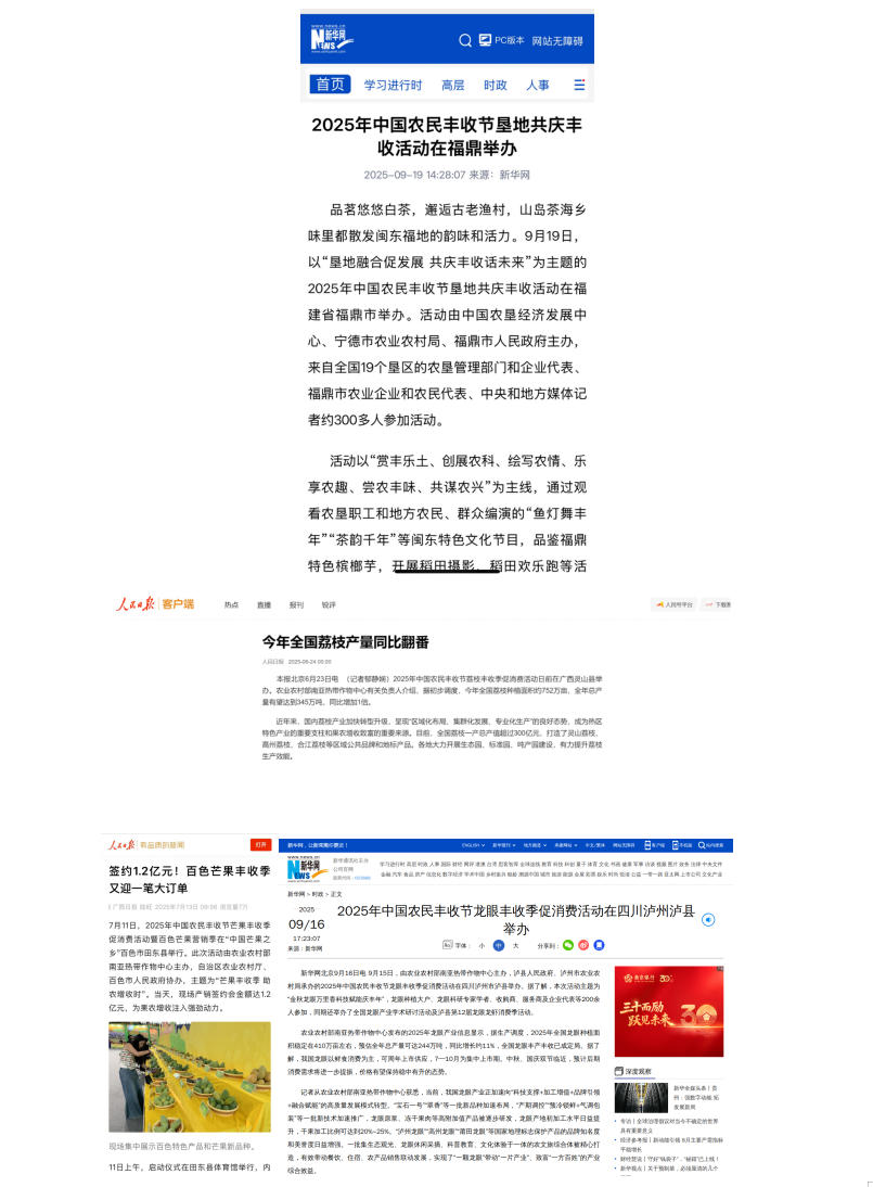 組織舉辦2025年中國農民豐收節(jié)墾地共慶豐收活動以及荔枝、芒果、龍眼豐收季促消費活動,人民日報、新華網、農民日報等媒體宣傳報道。