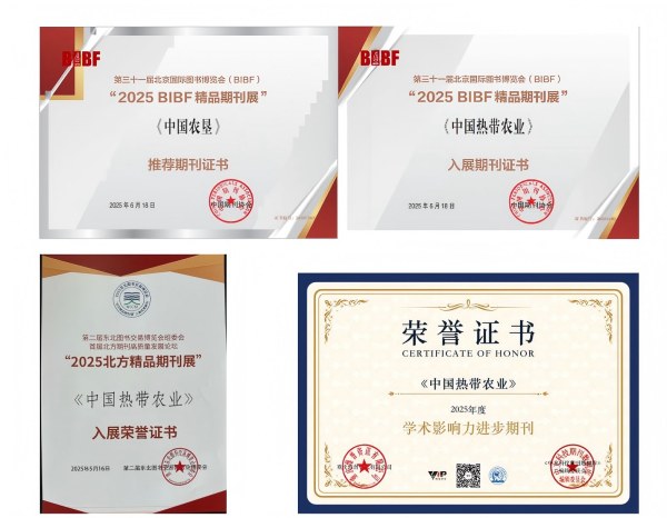 兩刊編輯出版工作取得新成績?!吨袊r墾》獲“2025BIBF精品期刊展”推薦期刊證書;《中國熱帶農業(yè)》獲“2025BIBF精品期刊展”入展期刊證書、“2025北方精品期刊展”入展榮譽證書,并被維普評為2025年度學術影響力進步期刊。