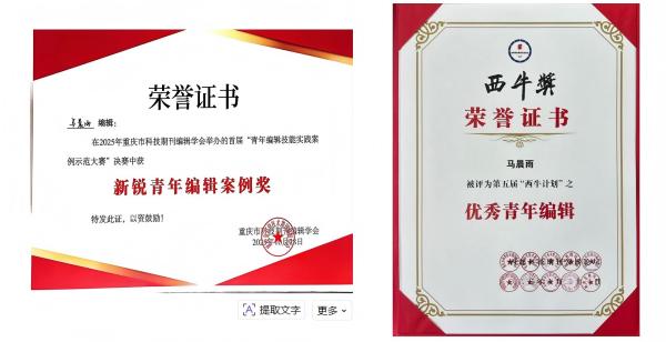 馬晨雨同志在“青年編輯技能實踐案例示范大賽”中獲得“新銳青年編輯案例獎”,獲得西部科技期刊發(fā)展論壇第五屆“西牛計劃”之“優(yōu)秀青年編輯”稱號。