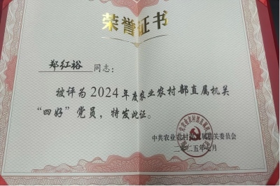 鄭紅裕同志獲評2023—2024年度農業(yè)農村部直屬機關優(yōu)秀共產黨員。
