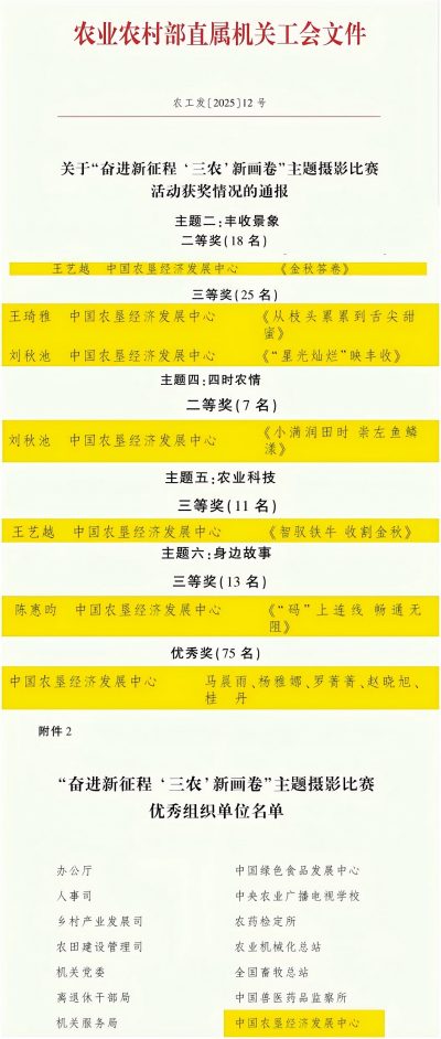 在農業(yè)農村部直屬機關工會組織的“奮進新征程‘三農’新畫卷”主題攝影比賽中,中心榮獲優(yōu)秀組織單位,11項作品獲獎:王藝越同志榮獲1項二等獎、1項三等獎;劉秋池同志榮獲1項二等獎、1項三等獎;王琦雅同志榮獲1項三等獎;陳慧昀同志榮獲1項三等獎;馬晨雨、楊雅娜、羅菁菁、趙曉旭、桂丹五位同志榮獲優(yōu)秀獎。