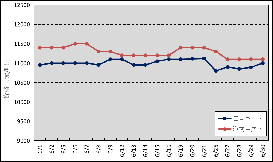 國(guó)內(nèi)主產(chǎn)區(qū):6月,國(guó)內(nèi)云南產(chǎn)區(qū)已經(jīng)全面開(kāi)割,但雨水較多,產(chǎn)量較往年同期偏少;海南產(chǎn)區(qū)天氣整體偏好,有利于新鮮膠水的產(chǎn)出。云南和海南原料膠(折干膠)月均價(jià)格分別為10996元/噸、11285元/噸,環(huán)比上漲666元/噸、下跌250元/噸。