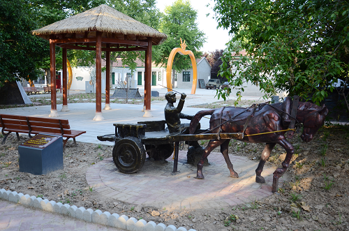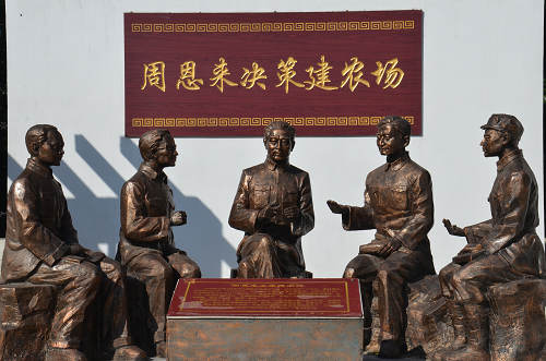 進(jìn)入大院便是奮進(jìn)園,周恩來(lái)總理和幾位墾荒者的巨型雕塑矗立其中。巨雕西面是群體雕塑“周恩來(lái)決策建農(nóng)場(chǎng)”;東面是一條綠樹掩映的半圓形文化長(zhǎng)廊,展出著農(nóng)場(chǎng)各個(gè)時(shí)期的珍貴照片;南面是“福滿路”,路上錯(cuò)落分布著五個(gè)巨大的蘋果門,每個(gè)門上各有一種糧食作物的圖案,寓意平平安安、五谷豐登。福滿路兩側(cè)立著24節(jié)氣石牌。