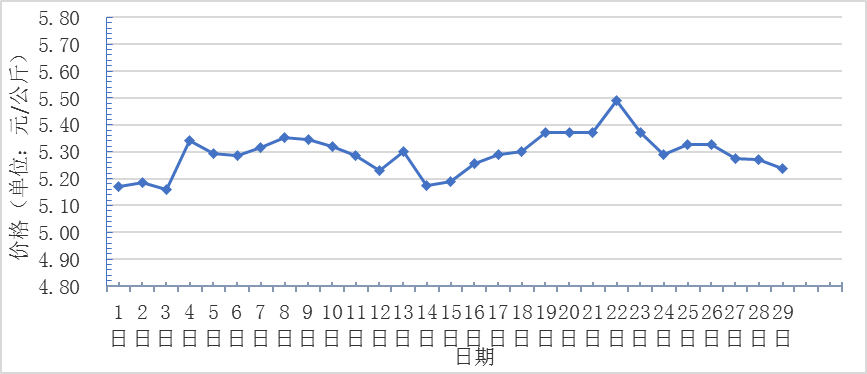 2月,全國重點(diǎn)監(jiān)測農(nóng)產(chǎn)品批發(fā)市場香蕉總交易量達(dá)1.9萬噸,同比下降13.6%,環(huán)比下降20.8%;總交易價值9969.1萬元,同比下降32.4%,環(huán)比下降51.7%。日平均價格最高為5.5元/千克,最低為5.2元/千克,全月平均價格為5.3元/千克,同比下降13.1%,環(huán)比基本持平(每日價格變化如圖)。