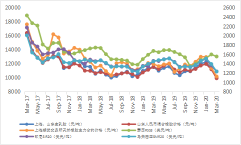 注:數(shù)據(jù)來源于中國農墾經(jīng)濟發(fā)展中心、中國天然橡膠協(xié)會,主縱坐標為全乳膠上海、山東市場均價,上海期貨交易所天然橡膠主力合約月均價,次縱坐標為泰國RSS3、印尼SIR20、馬來西亞SMR20的離岸月均價。