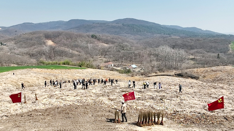 安徽農(nóng)墾白米山農(nóng)場(chǎng)公司與南京林業(yè)大學(xué)林草學(xué)院共同舉辦黨建共建義務(wù)植樹(shù)活動(dòng)現(xiàn)場(chǎng)。(無(wú)人機(jī)圖片 攝影:朱青)